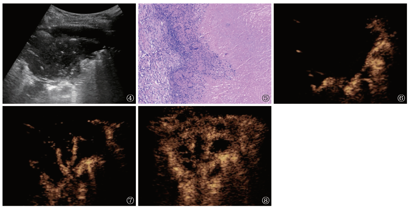 目的 探讨常规超声联合超声造影在胸膜下肺结核与细菌性肺炎鉴别诊断中的应用价值。方法 搜集2019年1—5月就诊于上海市肺科医院并经病理学、细菌学或诊断性治疗确诊为肺结核患者(结核组)35例,细菌性肺炎患者(肺炎组)16例。对比分析两组病灶常规超声及超声造影图像,比较病灶大小、位置、形态、回声,以及超声造影增强模式、开始增强时间、达峰时间、消退速度、坏死发生率及特征等。结果 (1)常规超声显示的病灶形态:结核组28例(80.00%)呈楔形,5例(14.29%)呈类圆形,2例(5.71%)呈不规则形。肺炎组10例(62.50%)呈楔形,6例(37.50%)呈类圆形,两组间差异无统计学意义(χ2=4.109,P=0.128)。病灶深部与正常肺组织间可见高回声,其中呈“碎片征”者结核组11例(31.43%),肺炎组13例(81.25%),两组间差异有统计学意义(χ2=10.940,P=0.001);呈“瀑布征”者结核组22例(62.86%),肺炎组3例(18.75%),两组间差异有统计学意义(χ2=8.548,P=0.003)。(2)超声造影的特征:病灶开始增强时间结核组为[8.43(4.79,10.83)]s,肺炎组为[7.80(5.51,12.26)]s,差异无统计学意义(U=0.721,P=0.471);病灶与正常肺组织开始增强时间差结核组为[1.47(0.56,2.01)]s,肺炎组为[2.00(1.28,2.67)]s,差异无统计学意义(U=1.453,P=0.146);病灶增强峰值强度结核组为(-41.89±5.72)dB,肺炎组为(-44.89±5.72)dB,差异无统计学意义(t=1.738,P=0.089);病灶增强强度减半时间结核组为[153.33(124.02,180.00)]s,肺炎组为[138.45(128.70,147.09)]s,差异无统计学意义(U=1.326,P=0.185)。结核组29例(82.86%)病灶出现坏死,肺炎组5例(31.25%)出现坏死,前者明显高于后者(χ2=13.160,P=0.000)。在坏死区形态方面,结核组中15例(51.72%,15/29)表现为病灶内多个不相互连续的筛孔样坏死,11例(37.93%,11/29)表现为形态规则、内壁规整的大片状坏死,3例(10.35%,3/29)表现为病灶内部几乎全坏死仅存残留活性边缘的环状增强。肺炎组中1例表现为形态规则、内壁规整的大片状坏死(1/5),4例表现为形态规则、内壁规整的小片状坏死(4/5),两组间差异有统计学意义(χ2=26.692,P=0.000)。结论 常规超声中细菌性肺炎病灶后方具有特征性的“不规则碎片样”高回声表现,超声造影显示肺结核病灶坏死发生率明显高于细菌性肺炎,且呈“筛孔样”及“规则大片状”坏死特点,可为两者的鉴别提供一定的诊断依据。