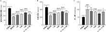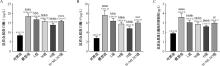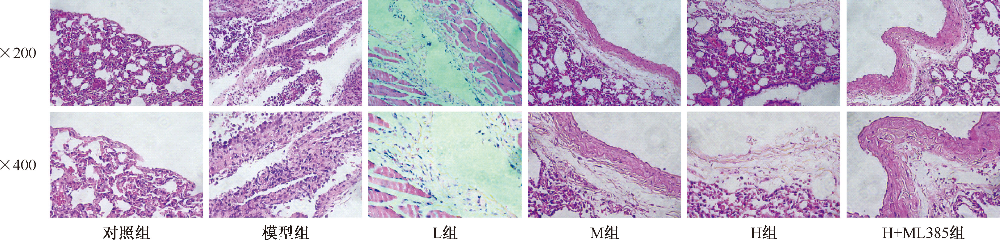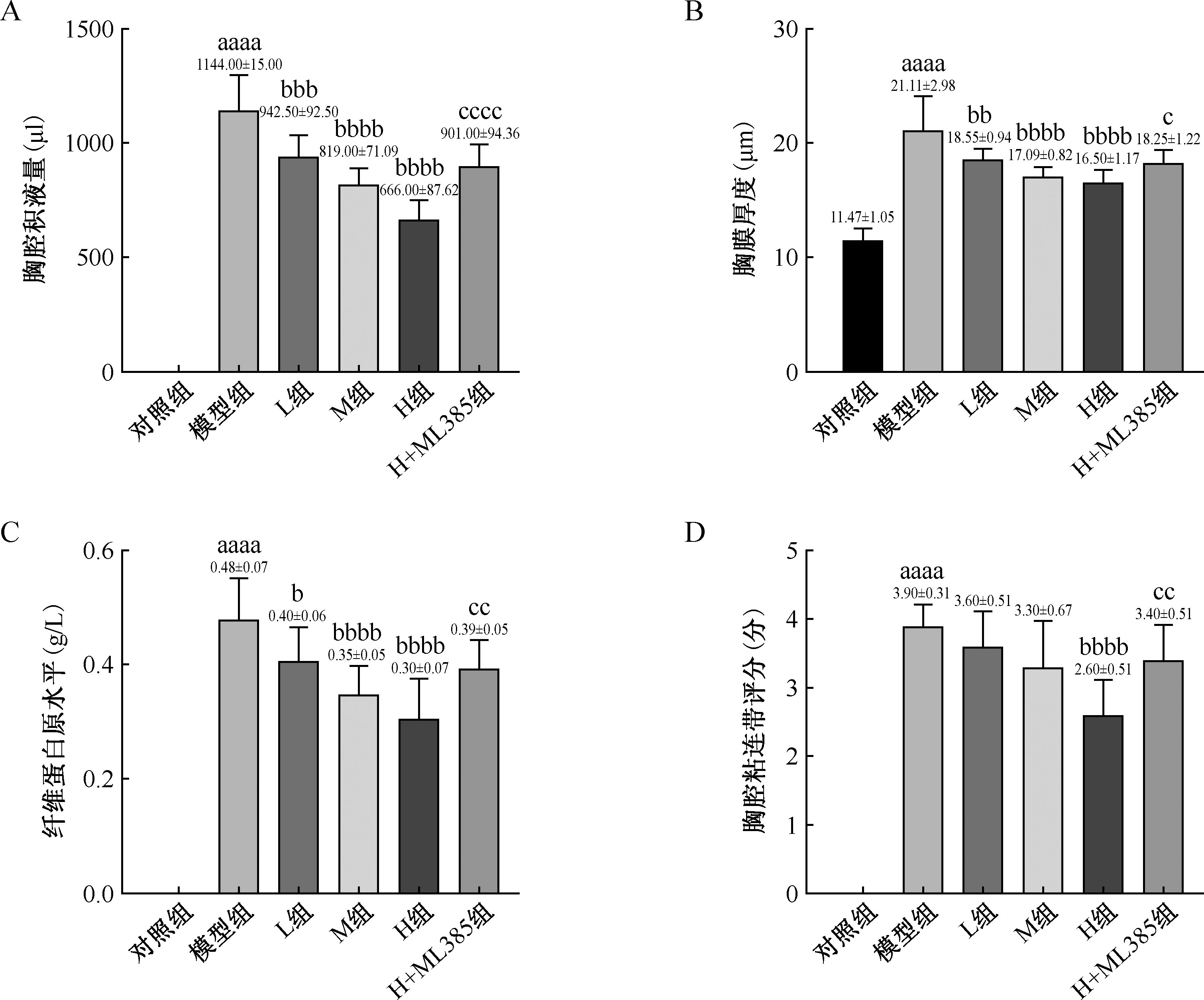 目的: 探讨水蛭素通过调控核因子E2相关因子2(Nrf2)/血红素加氧酶-1(HO-1)信号通路对小鼠结核性胸膜纤维化的影响。方法: 60只体质量在20~25g的C57雄性小鼠随机分为对照组、模型组、低剂量水蛭素组(L组)、中剂量水蛭素组(M组)、高剂量水蛭素组(H组)、高剂量水蛭素+ML385(Nrf2转录抑制剂)组(H+ML385组)。除对照组外,其余各组均注射卡介苗(BCG)的悬液造模。28d后观察各组小鼠胸腔积液的分布情况,收集、记录胸腔积液量;并观察胸膜粘连情况,采用胸腔积液中纤维蛋白原(FBG)水平和胸腔粘连带数量评分评估小鼠胸腔积液粘连性,测量胸膜厚度,通过苏木精-伊红(HE)染色观察各组小鼠胸膜组织病理学改变情况,采用Western blot法检测各组小鼠胸膜组织中Nrf2和HO-1蛋白表达,采用酶联免疫吸附试验法检测各组小鼠胸膜组织中基质金属蛋白酶(MMP-1、MMP-9)、基质金属蛋白酶抑制剂-1(TIMP-1)、丙二醛(MDA)、超氧化物歧化酶(SOD)、谷胱甘肽(GSH)的含量。结果: 28d后,H组胸腔积液量为(666.00±87.62)μl,胸膜厚度为(16.50±1.17)μm,胸腔粘连带评分为(2.60±0.51)分,FBG为(0.30±0.07)g/L,MDA为(74.51±6.53)mmol/mg,MMP-1为(14.08±0.85)μg/L,MMP-9为(4.84±0.38)μg/L,TIMP-1为(2.63±0.13)μg/L,均明显低于模型组[分别为(1144.00±15.00)μl、(21.11±2.98)μm、(3.90±0.31)分、(0.48±0.07)g/L、(102.70±14.06)mmol/mg、(18.54±1.20)μg/L、(7.65±1.02)μg/L、(3.62±0.36)μg/L];SOD及GSH分别为(134.00±8.07)U/mg和(350.80±15.73)nmol/g,均明显高于模型组的(90.79±4.68)U/mg和(247.30±22.28)nmol/g,差异均有统计学意义(t=8.48, P<0.001;t=4.54, P<0.001;t=6.79, P<0.001;t=5.53, P<0.001;t=5.73, P<0.001;t=9.57, P<0.001;t=8.16, P<0.001;t=8.10, P<0.001;t=14.64, P<0.001;t=12.00, P<0.001)。HE染色显示,与模型组相比,水蛭素干预组(特别是高剂量组)小鼠的胸膜纤维化病理改变明显减轻。Western blot结果显示,H组Nrf2蛋白表达为0.83±0.07,明显高于模型组的0.57±0.06,也明显高于H+ML385组的0.67±0.50,差异均有统计学意义(t=8.36,P<0.001;t=4.09,P=0.017);H组HO-1蛋白表达为0.72±0.03,明显高于模型组的0.31±0.02,差异有统计学意义(t=8.36,P<0.001)。结论: 水蛭素可以通过调节Nrf2/HO-1信号通路来抑制氧化应激,从而改善结核性胸膜纤维化。