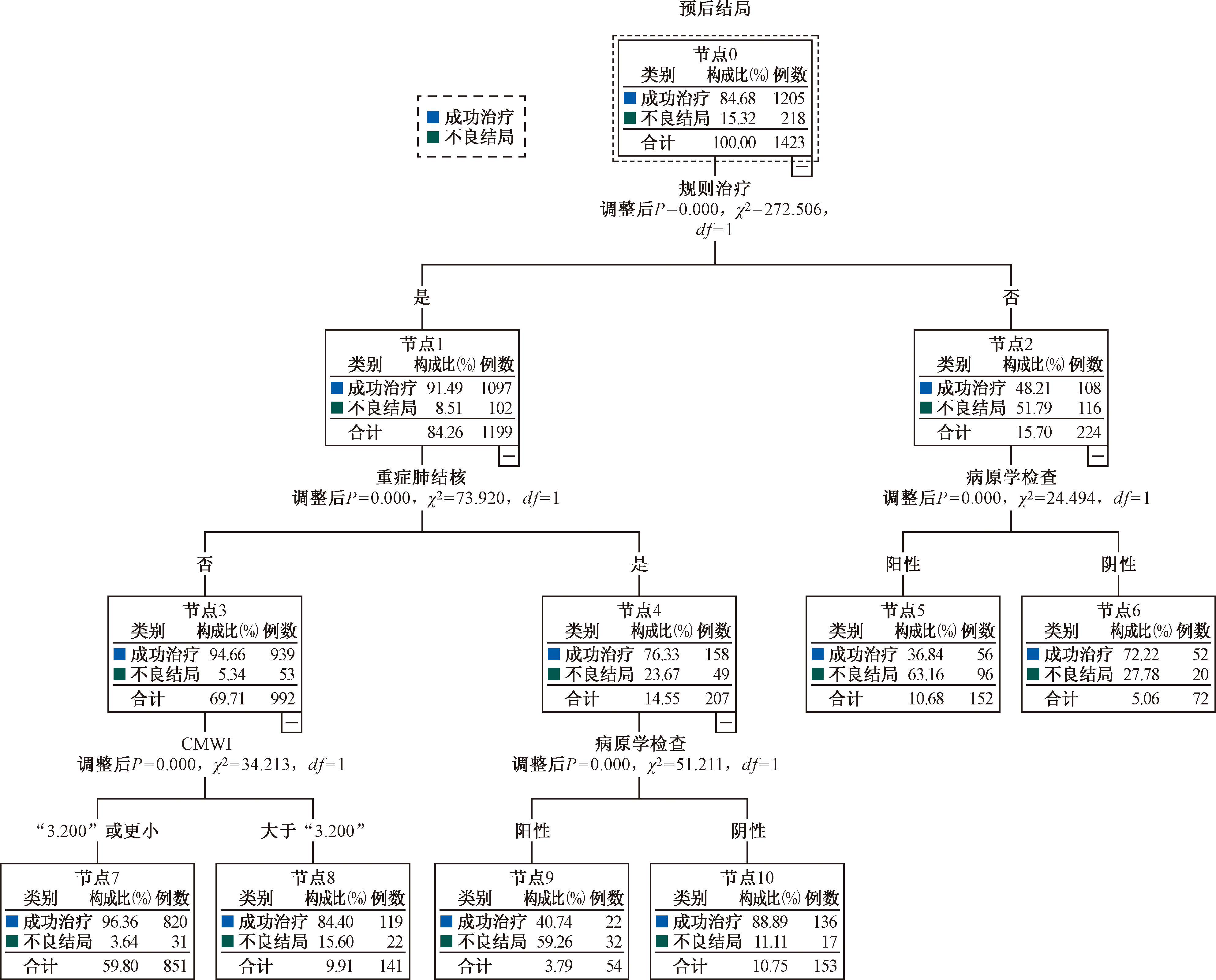 Objective: Using the Chinese Multimorbidity-weighted Index (CMWI), a model for predicting the prognosis of elderly pulmonary tuberculosis patients with comorbidities was established, to provide a reference basis for formulating prevention and treatment strategies for comorbidities of pulmonary tuberculosis in the elderly. Methods: A retrospective cohort study was conducted on 1423 elderly pulmonary tuberculosis patients with comorbidities admitted to Guangzhou Chest Hospital from January 1, 2016 to December 31, 2023. The study started from the date of diagnosis of pulmonary tuberculosis, and the follow-up observation period was 18 months, taking prognosis of study subjects as final outcomes. Information of the subjects was collected from the “TB Information Management System” of the “China Disease Control and Prevention Information System”, medical records, the “tuberculosis patient treatment record card of Guangzhou”, and the “tuberculosis patient treatment management registration card of Guangzhou”. Characteristics and prognosis of patients were analyzed using descriptive methods, followed by logistic regression analysis to identify influencing factors and establish a predictive model. Results: Among 1423 elderly pulmonary tuberculosis patients with comorbidities, 1205 cases (84.68%) got treatment success, and 218 cases (15.32%) got unfavorable outcomes. Higher age (HR=1.054,95%CI:1.033-1.076), non-local-registered residence (HR=1.655,95%CI:1.058-2.621), clinical symptoms (HR=2.216,95%CI:1.333-3.683), positive etiological examination result (HR=3.802,95%CI:2.512-5.754), severe pulmonary tuberculosis (HR=4.628,95%CI:2.968-7.216), and high CMWI (Chinese multimorbidity-weighted index,CMWI)(HR=1.301,95%CI:1.196-1.415) were risk factors for adverse treatment outcomes; regular treatment (HR=0.285,95%CI: 0.180-0.451) was a protective factor. We established a predictive model as logit P=-8.136+0.053X1+0.510X2+0.796X3+1.335X6+1.532X9-1.254X10+0.263X11. The goodness of fit test showed that the model fit well (χ2=8.055, P=0.428). The total accuracy using backtesting and interaction verification methods were 87.70% and 88.19%, respectively, indicating good prediction accuracy. The diagnostic performance of the model was as follows: area under the curve (AUC) was 0.870 (95%CI: 0.844-0.896), optimal critical point was 0.189, sensitivity was 73.53%, missed diagnosis rate was 26.47%, specificity was 86.98%, misdiagnosis rate was 13.02%, and Jordan index was 0.605, showing the model having made good performance. A decision tree model was constructed using machine learning algorithms which consisted of 3 layers, 11 nodes, and 4 explanatory variables, with regular treatment as the root node, followed by severe tuberculosis, etiological examination result, and CMWI as child nodes. The probability of getting treatment success was highest (96.36%) for patients with regular treatment, non-severe pulmonary tuberculosis, and CMWI≤3.2. ROC curve for this model showed: area under the curve (AUC) was 0.843 (95%CI: 0.812-0.875), optimal critical point was 0.134, sensitivity was 77.98%, missed diagnosis rate was 22.02%, specificity was 79.34%, misdiagnosis rate was 20.66%, and Jordan index was 0.573. Brier score was 0.089. Calibration curve indicated good predictive accuracy. Decision curve demonstrated good clinical applicability. Conclusion: The prognostic outcome predictive model for elderly pulmonary tuberculosis patients with comorbidities based on the CMWI has good application value and provides scientific basis for exploring the management of comorbidities of pulmonary tuberculosis in the elderly.