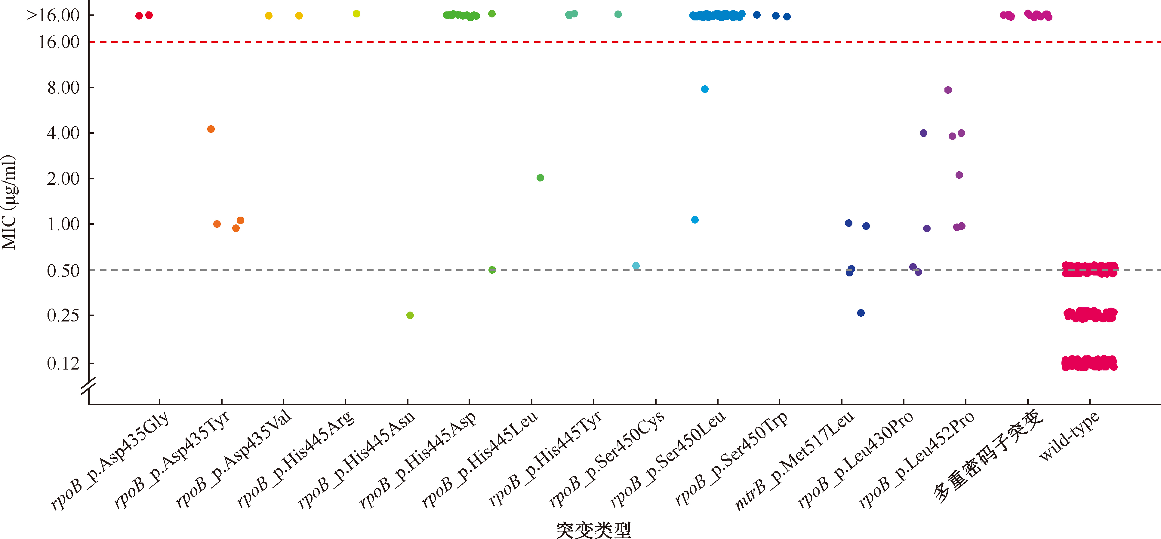 Objective:To learn about the mutation characteristics of the rpoB gene in Mycobacterium tuberculosis (MTB) in Shanghai,and explore the correlation between rpoB gene mutation and rifampin resistance level. Methods:Strains of pulmonary tuberculosis patients who were newly registered and culture-positive in Shanghai from 2020 to 2022 were selected using a simple random sampling. Minimal inhibitory concentration (MIC) drug susceptibility test was performed on 2766 MTB strains. After excluding duplicate samples and those with failed tests,valid phenotypic drug susceptibility results were obtained from 2734 strains. Whole genome sequencing (WGS) was performed on 462 strains from these patients (176 retreatment and 286 primary patients). After excluding 12 non-compliant samples,450 MTB strains were analyzed for rifampicin resistance gene mutations,then the relationship between rpoB mutation type and rifampicin MIC were analyzed with Wilcoxon rank sum test. Results:Among the 450 strains of clinical MTB,139 strains (including 8 RFP sensitive strains,18 strains with low-level RFP resistant and 113 strains with high-level RFP resistant) had RFP resistance gene mutations,among which 95.68% (133/139) of the mutations occurred in the rifampicin rpoB RRDR region. The most frequent rpoB gene mutations were observed at codons 450,445 and 435,which had mutated frequencies of 60.43% (84/139),21.58% (30/139) and 7.91% (11/139),respectively. The Wilcoxon rank sum test showed that rpoB_p.Ser450Leu,rpoB_p.Ser450Trp,rpoB_p.His445Asp,rpoB_p.His445Tyr,rpoB_p.Asp435Gly,rpoB_p.Asp435Val,rpoB_p.Asp435Tyr and rpoB_p.Leu452Pro were significantly associated with RFP resistance (Ps<0.05). Among them,stains with these five mutations (rpoB_p.Ser450Leu,rpoB_p.Ser450Trp,rpoB_p.His445Asp,rpoB_p.His445Tyr and rpoB_p.Asp435Val) had a median MIC over 16 μg/ml,showing high level resistance. The median MIC values for rpoB_p.Asp435Gly,rpoB_p.Asp435Tyr and rpoB_p.Leu452Pro mutant strains were 4 μg/ml,1 μg/ml and 4 μg/ml,respectively,showing low-level resistance. Among the RFP-resistant strains with multicodon mutations,70.59% (12/17) of the rpoB RRDR gene mutation were accompanied by compensatory mutations of rpoA and rpoC or rpoB non-RRDR. All multicodon mutant strains showed high level resistance (MIC>16 μg/ml). Lineage analysis of 450 MTB strains revealed that the L2 lineage predominated at 88.44% (398/450),the L4 lineage accounted for 10.90% (49/450),while the L1 lineage accounted for the least,only 0.44% (2/450). One strain (0.22%) was identified as a mixed strain of both L2 and L4 lineages. Among RFP-resistant strains,the L2 lineage showed a higher proportion at 92.09% (128/139),while the L4 lineage accounted for 7.19% (10/139),and no L1 lineage resistant strains were detected. Analysis of sublineage distribution revealed that the L2 lineage was dominated by the L2.2.1 sublineage (55.78%,251/450),while the L4 lineage was primarily composed of the L4.4.2 and L4.5 sublineages,accounted for 4.00% (18/450) and 3.56% (16/450),respectively. Conclusion:Different rifampicin rpoB mutation types in Shanghai can cause different levels of RFP resistance. The mutation of rpoB_p.Ser450Leu,rpoB_p.Ser450Trp,rpoB_p.His445Asp,rpoB_p.His445Tyr and rpoB_p.Asp435Val are associated with high-level resistance of RFP. The mutation of rpoB_p.Asp435Gly,rpoB_p.Asp435Tyr and rpoB_p.Leu452Pro were associated with low-level resistance of RFP. Multicodon mutations,especially those carrying compensatory mutations,may synergistically enhance RFP resistance level.