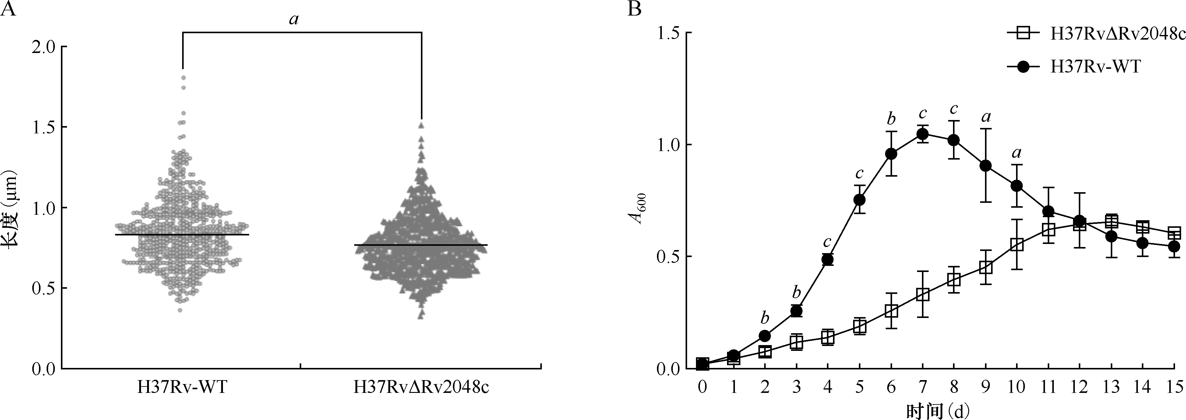Objective: To investigate the effect of Rv2048c gene knockout on the drug susceptibility of Mycobacterium tuberculosis (MTB). Methods: In this study, the MTB standard strain (H37Rv-WT) was used as a template to construct the Rv2048c gene knockout strain (H37RvΔRv2048c) via homologous recombination principle. Colony morphology, cell size, and cell wall integrity were evaluated through solid culture, acid-fast staining, and scanning electron microscopy. A growth curve was plotted to evaluate the growth rate. The minimum inhibitory concentration (MIC) was determined using the microplate method for drug susceptibility testing. Cell wall permeability was assessed using ethidium bromide staining. The biological characteristics, anti-tuberculosis drug susceptibility, and cell wall permeability of H37Rv-WT and H37RvΔRv2048c were systematically compared. Subsequently, the influence of the Rv2048c gene on MTB drug susceptibility and its potential mechanism were analyzed. Results: H37RvΔRv2048c was successfully constructed. Colony morphology transitioned from the rough type (R type) in H37RV-WT to the smooth type (S type) in H37RvΔRv2048c. Both strains exhibited rod-like structures with comparable cell wall compositions; however, the bacterial length of H37RvΔRv2048c was significantly shorter. The MIC of ethionamide (Eto) against H37RvΔRv2048c (1.25 μg/ml) was 1/4 of the MIC of Eto against H37Rv-WT (5.00 μg/ml); the MIC of amikacin (Am) against H37RvΔRv2048c (0.25 μg/ml) was 1/4 of the MIC of Am against H37Rv-WT (1.00 μg/ml). After ethidium bromide staining, the fluorescence intensity of H37RvΔRv2048c (1.526 RFU) was significantly higher than that of H37Rv-WT (0.924 RFU)(t=16.960, P<0.001). Conclusion: Deletion of the Rv2048c gene results in reduced MIC values for Eto and Am. This gene may modulate MTB susceptibility to Eto and Am by altering cell wall permeability. This study provides new insights into MTB drug resistance mechanisms and identifies potential targets for enhancing the effectiveness of Eto and Am.
