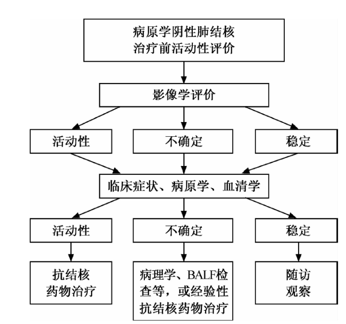 影像学推荐分类判断原则,判断意见一般分为活动性、稳定及不确定等3种情况,这符合病理-影像学演变的客观性原则。对于不确定的情况需要选择影像学手段(如HRCT、CT增强扫描)或支气管镜检查,并进一步获得病原学和组织学证据。同样对于影像学“稳定”也推荐进行临床综合评价,以利于最终做出“治”与“不治”的临床决策。