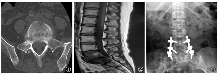 全部患者均由美国GE Definium新飞天6000型DR数字化摄影系统进行腰骶椎脊柱正侧位X线检查;采用日本日立公司Scenaria 64排128层螺旋CT扫描,层间距5mm,层厚5mm。采用德国西门子ESSENZA 1.5T超导MR仪分别行矢状位和横轴位的T1加权成像(重复时间400~800ms,回波时间11~14ms)、T2加权成像(重复时间1800~3000ms,回波时间100~200ms)序列进行扫描,层厚3~4mm,层间距4~5mm。