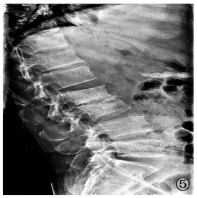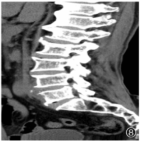 病例6,男性,81岁。患者于2021年6月3日在陕西省结核病防治院摄腰椎CT(矢状面),显示腰1~骶1椎体前缘骨质增生变尖,腰5椎体前缘骨质轻度破坏,椎前可见低密度软组织影