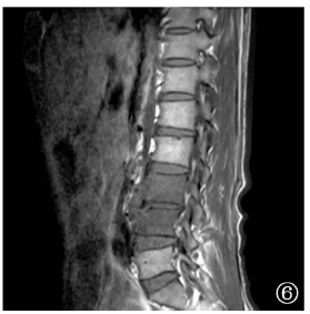 | 图6 病例4,男性,62岁。2018年8月22日于外院摄腰椎MRI,显示腰3~4椎体前缘变尖、椎间隙狭窄,可见斑片状短T1、长T2信号影,压脂序列呈高信号,增强扫描明显强化,T2加权成像显示部分椎间盘信号降低,腰3~4椎间盘组织向椎体后方突出,硬膜囊轻度受压,椎管无狭窄 |
