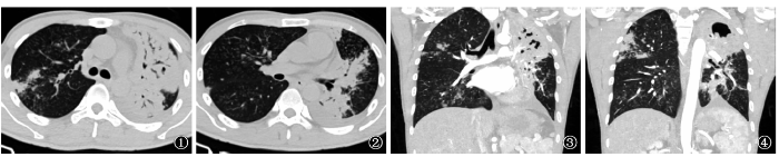 患者,男,32岁,因“咳嗽、咳痰3个月,咯血3d”入院。患者自诉3个月前劳累后出现阵发性咳嗽,咳白色黏痰,痰少,易咳出,未予重视。3d前剧烈咳嗽,出现咯血1次,鲜红色,量约180ml,伴乏力。体格检查:体温:36.2℃,脉搏:128次/min,呼吸频率:20次/min,血压:114/77mm Hg(1mm Hg=0.133kPa)。急性病容,神志清楚,唇稍发绀,左肺呼吸音低,双肺可闻及湿性啰音。实验室检查:血常规:白细胞计数:4.73×109/L、淋巴细胞百分比:12.70%、中性粒细胞百分比:78.90%。血红细胞沉降率:45mm/1h。C反应蛋白:101.20mg/L。肝肾功能正常。凝血功能检查(血浆):纤维蛋白原:5.20g/L、D-二聚体:2.52mg/L。痰涂片检查:抗酸杆菌(++++);GeneXpert MTB/RIF检测(痰液):结核分枝杆菌阳性,利福平敏感。心电图正常。肺部CT扫描示双肺各叶可见多发、多形态病变,左肺为著,考虑继发性结核,双肺多发播散病灶,双上肺多发空洞,左上支气管牵拉扩张,左肺合并感染可能。左侧胸膜增厚,胸腔少量积液(图1~4)。治疗方案:头孢哌酮钠舒巴坦(1.5g,1次/12h)抗感染,垂体后叶素1U/h微量泵入、卡络磺钠静脉滴注等止血,异烟肼(0.3g,1次/d)、利福平(0.45g,1次/d)、吡嗪酰胺(1.5g,1次/d)、乙胺丁醇(0.75g,1次/d)抗结核治疗及其他对症支持治疗。