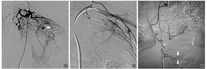 患者经保守治疗效果欠佳,仍间断咯血,入院24h内咯血总量约200ml。遂请介入科会诊,有介入治疗指征,经与患者家属沟通后,予支气管动脉栓塞术止血治疗。具体手术方式:常规消毒、局部麻醉,采用经皮穿刺技术,穿刺右侧股动脉,置入5F血管鞘,分别以4F Cobra导管超选择性插管至左、右支气管动脉,左、右肋间动脉,左侧锁骨下动脉,左甲状颈干,左胸外侧动脉等动脉血管,以适当的流速、流量注入碘克沙醇并摄影,术中造影剂总量为140ml左右。CT血管造影示右侧支气管动脉1支、左侧支气管动脉2支、左甲状颈干、左胸外侧动脉、左上1支肋间动脉增粗、增生、紊乱,见异常染色征象,左甲状颈干、左胸外侧动脉见体动脉-肺动脉瘘征象,左上肺野见一类圆形假性动脉瘤(图5,6)。以上征象符合肺结核继发血管病变。另见左侧1支支气管动脉异位起源于胃左动脉(图7),以上咯血责任血管,结合微导管超选择性插管后应用聚乙烯醇颗粒栓塞剂(PVA-560)栓塞双侧BA及起源于胃左动脉的异位BA;针对左甲状颈干、左胸外侧动脉、左上1支肋间动脉采用PVA-560联合自制明胶海绵颗粒进行栓塞。栓塞后造影示主干以下分支闭塞,体-肺循环瘘、假性动脉瘤消失。术毕,拔管、拔鞘,加压包扎。术中患者一般情况可,收缩压:120~135mm Hg,舒张压:75~86mm Hg,血氧饱和度:97%,呼吸频率:约20次/min,心率:85~110次/min。术后未再出现咯血,生命体征平稳,双下肢活动正常,治疗后复查支气管动脉、肺动脉CT血管造影未见明显异常。继续予抗结核、抗感染、化痰等治疗后病情平稳,予带药出院。出院1个月复查CT扫描示肺内病灶较前明显吸收,患者间断痰中带血。