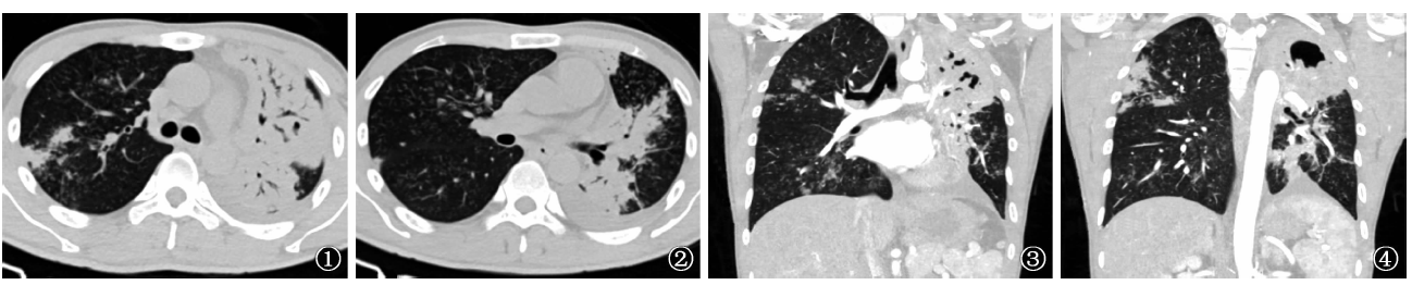 、4为胸部CT冠状位重建,显示左肺大片实变影,其内可见支气管充气征象、支气管扩张及空洞,右上叶后段胸膜下可见斑片影,双肺各叶多发腺泡结点样播散灶