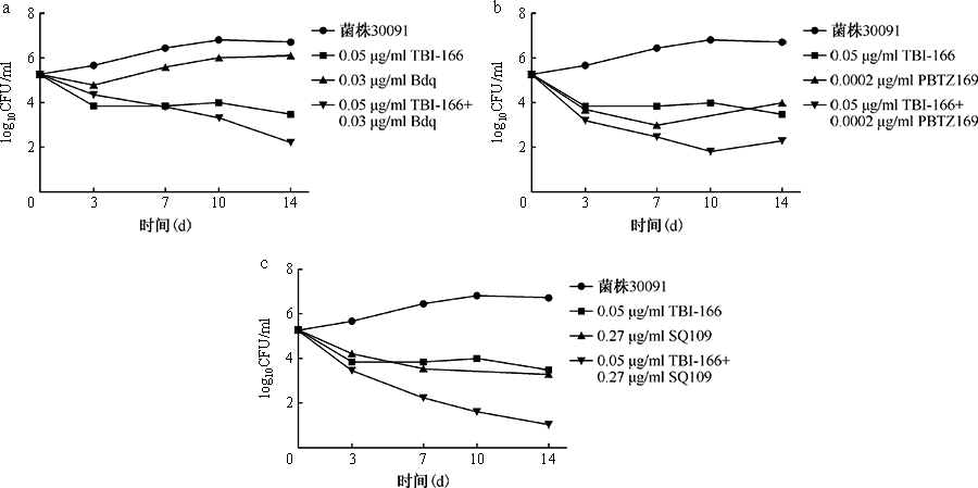 | 图2 单药及两药组合对结核分枝杆菌临床分离株30091的时间杀菌曲线图 注 图a为0.05μg/ml TBI-166、0.03μg/ml Bdq单用及两药组合时对菌株30091的时间杀菌曲线图;图b为0.05μg/ml TBI-166、0.0002μg/ml PBTZ169单用及两药组合时对菌株30091的时间杀菌曲线图;图c为0.05μg/ml TBI-166、0.27μg/ml SQ109单用及两药组合时对菌株30091的时间杀菌曲线图。TBI-166:吡法齐明;Bdq:贝达喹啉;菌株30091:药物敏感性结核分枝杆菌临床分离株 |
