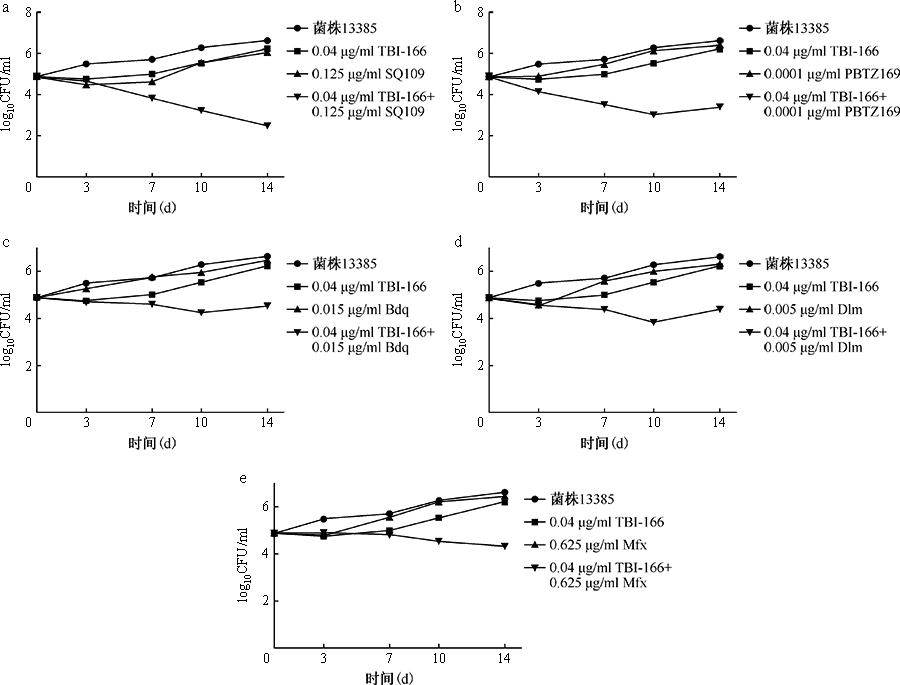 | 图3 单药及两药组合对结核分枝杆菌临床分离株13385的时间杀菌曲线图 注 图a为0.04μg/ml TBI-166、0.125μg/ml SQ109单用及两药组合时对菌株13385的时间杀菌曲线图;图b为0.04μg/ml TBI-166、0.0001μg/ml PBTZ169单用及两药组合时对菌株13385的时间杀菌曲线图;图c为0.04μg/ml TBI-166、0.015μg/ml Bdq单用及两药组合时对菌株13385的时间杀菌曲线图;图d为0.04μg/ml TBI-166、0.005μg/ml Dlm单用及两药组合时对菌株13385的时间杀菌曲线图;图e为0.04μg/ml TBI-166、0.625μg/ml Mfx单用及两药组合时对菌株13385的时间杀菌曲线图。TBI-166:吡法齐明;Bdq:贝达喹啉;Dlm:德拉马尼;Mfx:莫西沙星。菌株13385:前广泛耐药结核分枝杆菌临床分离株 |