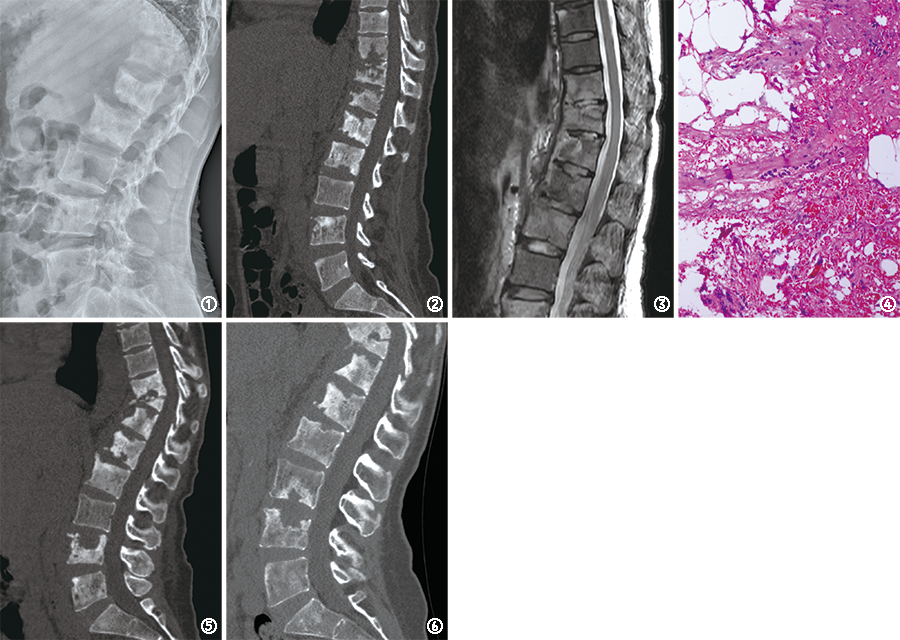 图1~6 病例1,患者,女,52岁。图1 2019年11月20日,胸椎及腰椎X线片提示第10胸椎至第2腰椎不均匀骨质破坏、硬化,腰1~2椎间隙稍变窄 图2 2019年11月20日,胸椎及腰椎CT提示胸10~11、11~12椎间隙变窄,第10胸椎至第2腰椎、第4和5腰椎椎体不规则骨质破坏,破坏周围骨质硬化,部分骨质破坏内可见点状死骨影像,病椎旁软组织肿胀 图3 2019年11月20日,腰椎MR提示第10至第2腰椎骨质破坏、骨髓水肿,周围软组织肿胀 图4 2020年1月14日,胸腰椎病损切除术后病理提示慢性肉芽肿性炎(HE ×10) 图5 2020年4月15日,复查腰椎CT提示第11胸椎压缩变扁,第4腰椎骨质破坏范围增大 图6 2022年3月6日,腰椎CT提示第3腰椎骨质破坏进展