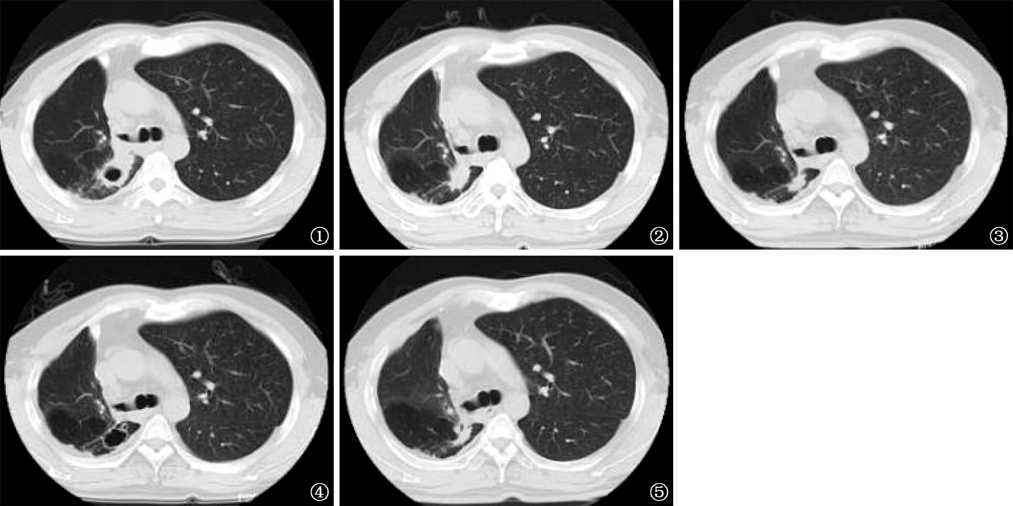 | 图1~5 患者,男性,准广泛耐药肺结核。图1为治疗前患者胸部CT检查图像,可见右肺空洞影(2022年4月)。图2为治疗3个月后胸部CT复查图像,可见右肺病变空洞较前明显缩小,部分空洞闭合(2022年8月)。图3为治疗12个月后胸部CT复查图像,可见右肺病变空洞进一步缩小(2023年5月)。图5为治疗19个月后胸部CT复查图像,可见右肺病变遗留小的薄壁空洞,基本为净化空洞(2023年12月)。图5为治疗24个月后胸部CT复查图像,可见右肺病变空洞基本闭合(2024年6月) |